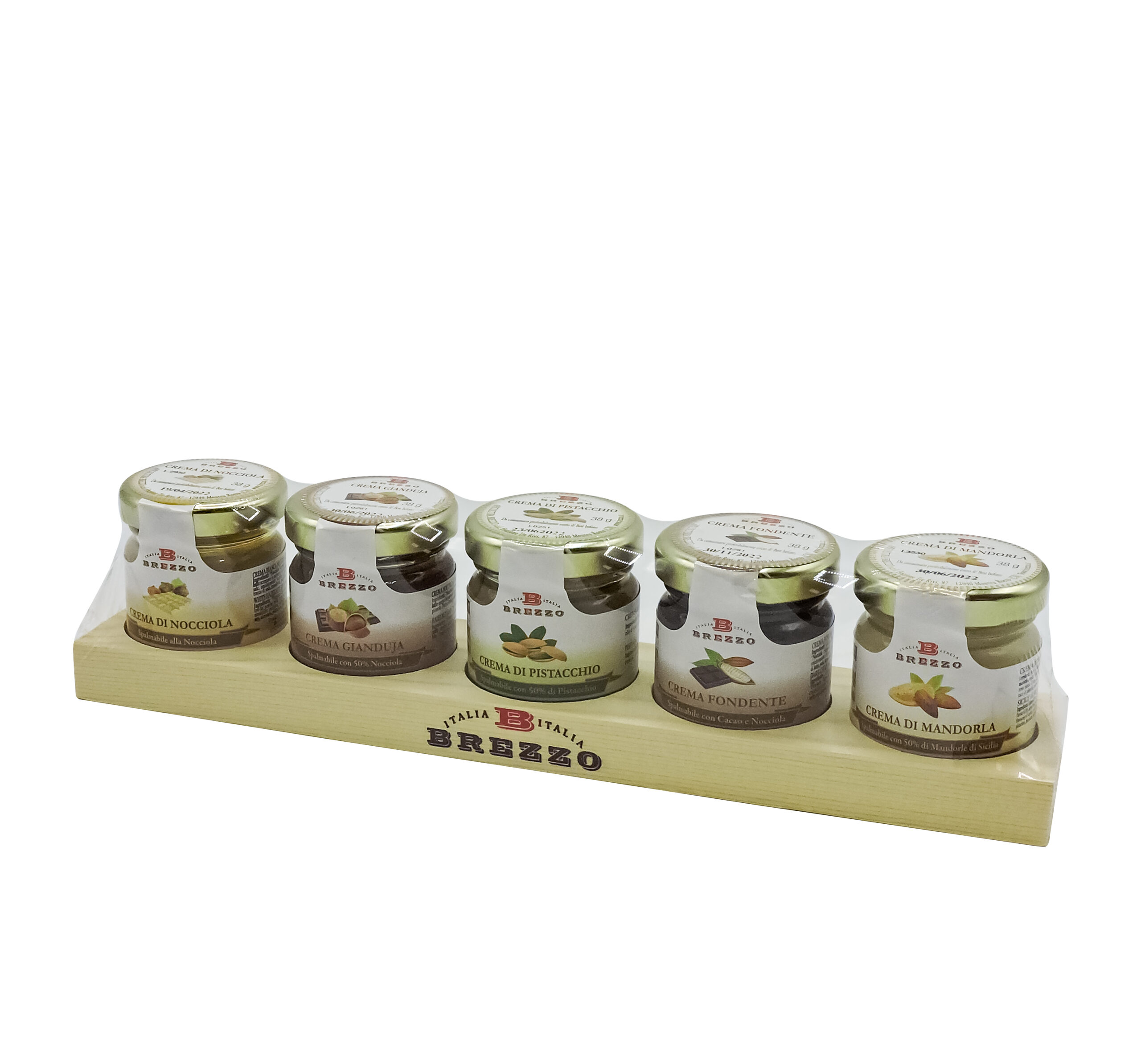 Crema fondente: Cacao 28%, olio di girasole, zucchero, “Nocciola Piemonte I.G.P.” 15%, burro di cacao, emulsionante: lecitina di girasole. Può contenere tracce di latte, soia, mandorle, pistacchi, pinoli, noci. Crema Pistacchio: Pistacchio 50%, Zucchero, Olio di mais, Latte scremato in polvere. Nocciolata: Miele Acacia 70%, Pasta di Nocciole 30%. Crema di mandorla: Pasta di mandorla 50% (di cui mandorla 99,9%, aroma mandorla amara 0,1%), burro anidro, zucchero di canna, latte intero in polvere, aroma naturale di vaniglia, emulsionante: lecitina di girasole. Può contenere tracce di pistacchi, nocciola, noci, noce Pecan, noce Macadamia e soia. Crema Nocciola Piemonte IGP: “Nocciola Piemonte I.G.P.” 36%, zucchero, latte scremato in polvere, olio di girasole, burro di cacao, sale, emulsionante: lecitina di girasole. Può contenere tracce di soia, mandorle, pistacchi, pinoli, noci.