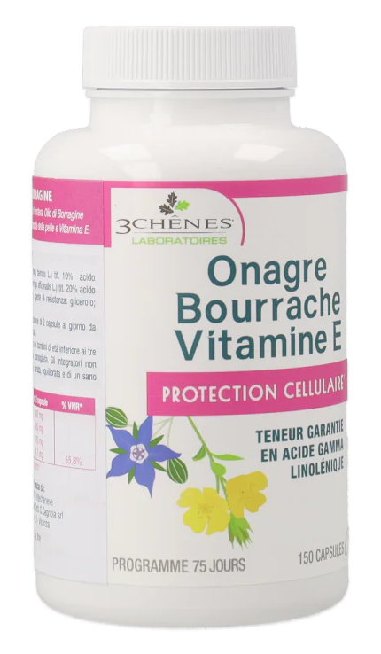 Integratore alimentare a base di olio di enotera (Oenothera biennis L.), borragine (Borago officinalis L.) e vitamina E (D-alfa tocoferolo). Favorisce il benessere della cute e l’idratazione oculare.