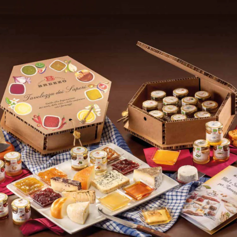 Questo Atlante dei Mieli vuole essere un tributo a questa ricchezza, attraverso il prodotto che più di altri è espressione diretta del territorio e delle sue caratteristiche: il Miele. L’Apicoltura Brezzo da più di sessanta anni produce e seleziona le migliori tipologie di mieli che si possono produrre in Italia. Questo cofanetto, che contiene 18 dei principali mieli uniflorali, regala a tutti gli appassionati un’esperienza di degustazione unica.