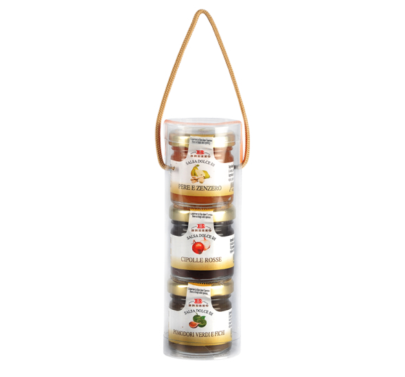 Elegante selezione di tre salse per formaggi contenuti in una simpatica borsa cilindrica. Idea perfetta per un regalo dolce e sfizioso, per una bomboniera o per un raffinato segnaposto.