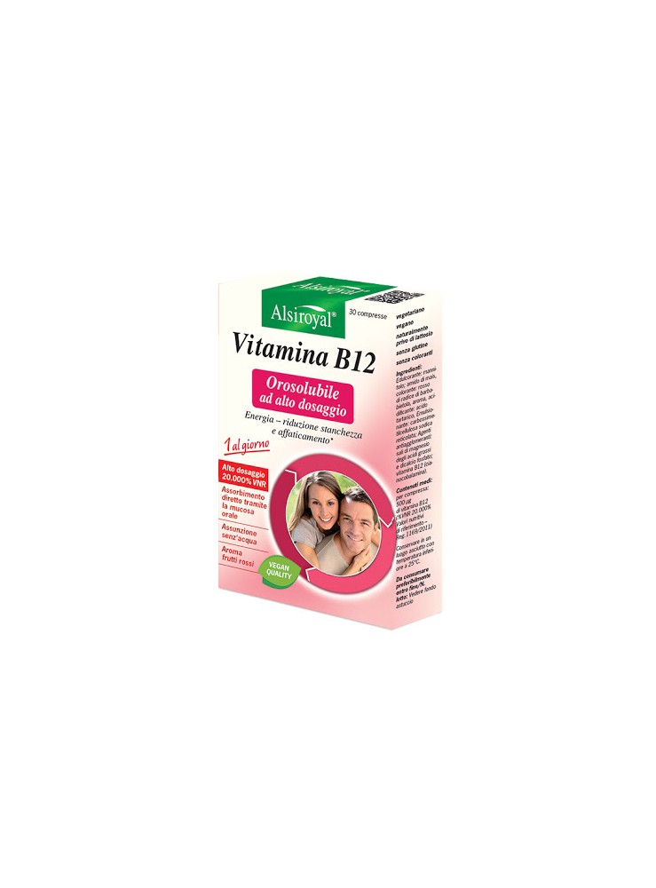 Integratore alimentare orosolubile di vitamina B12 (500 µg) ottenuta da fermentazione vegetale, utile in caso di stanchezza e affaticamento, nell’anziano e nei soggetti che seguono una dieta vegana.
